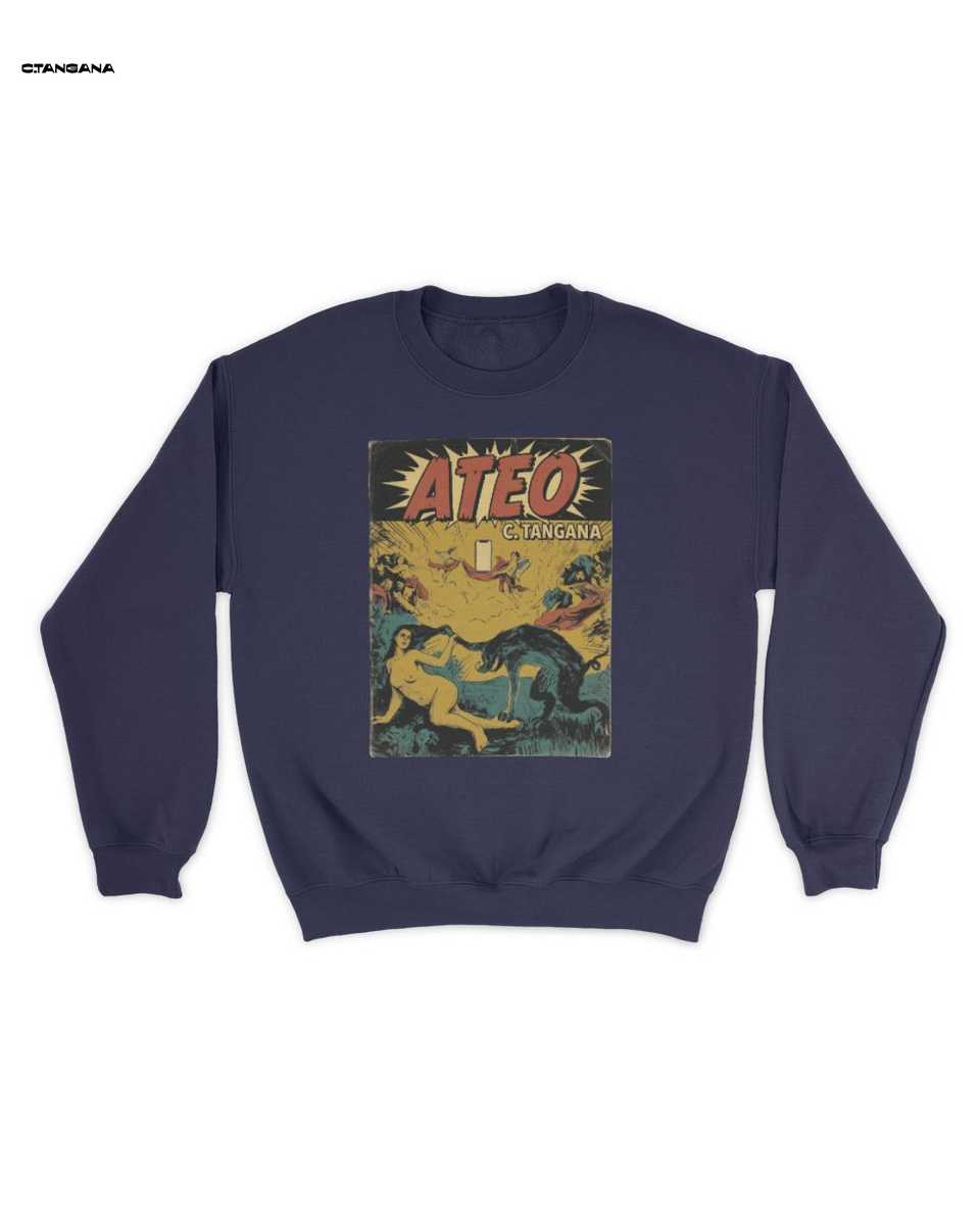 El diseño ‘ATEO’ es una fascinante portada de cómic pulp vintage que entrelaza elementos de arte religioso moderno y una estética retro. Presenta una ilustración vibrante con una figura femenina enigmática, una criatura misteriosa y motivos celestiales, todo en tonos intensos de amarillo, azul y verde. Inspirado en el C. Tangana estilo moda, es ideal para amantes del arte surrealista y la mitología.