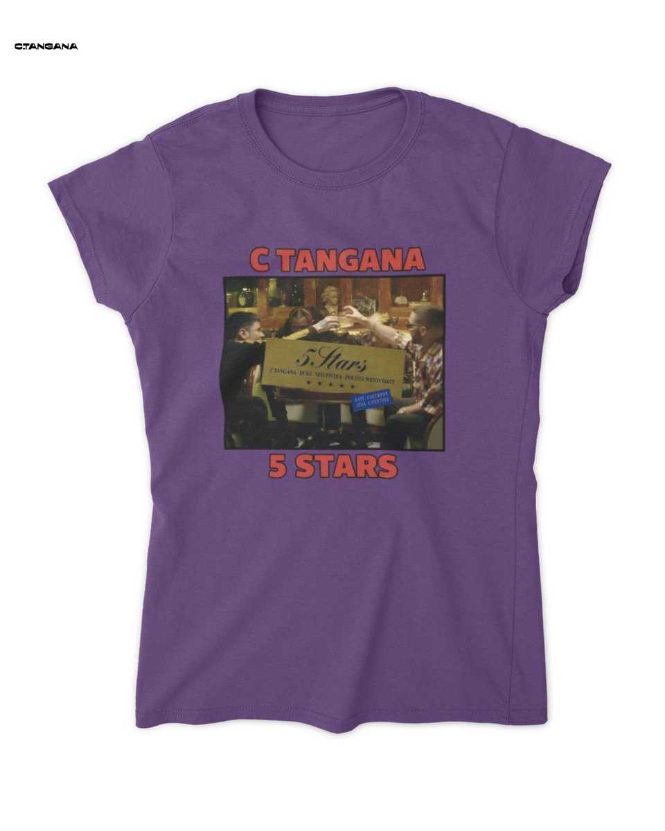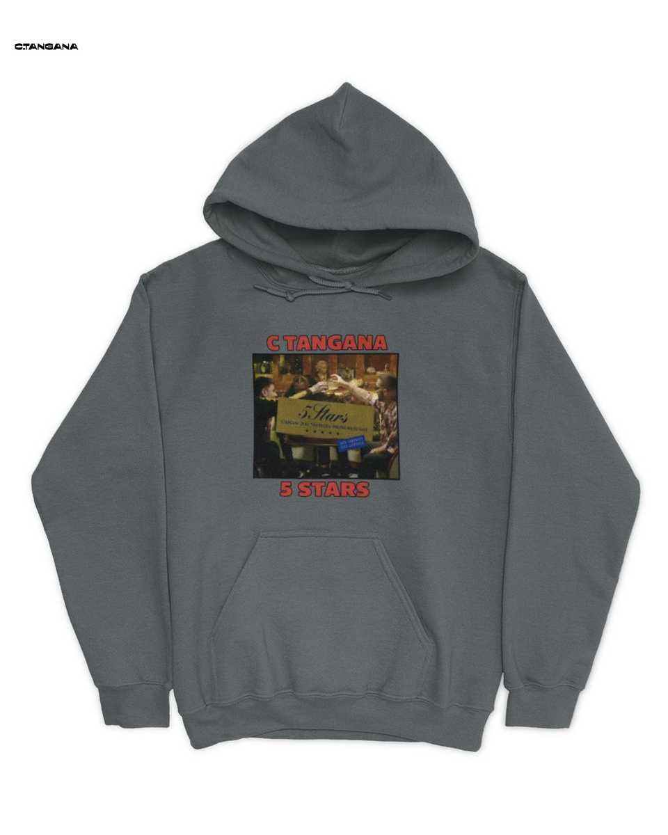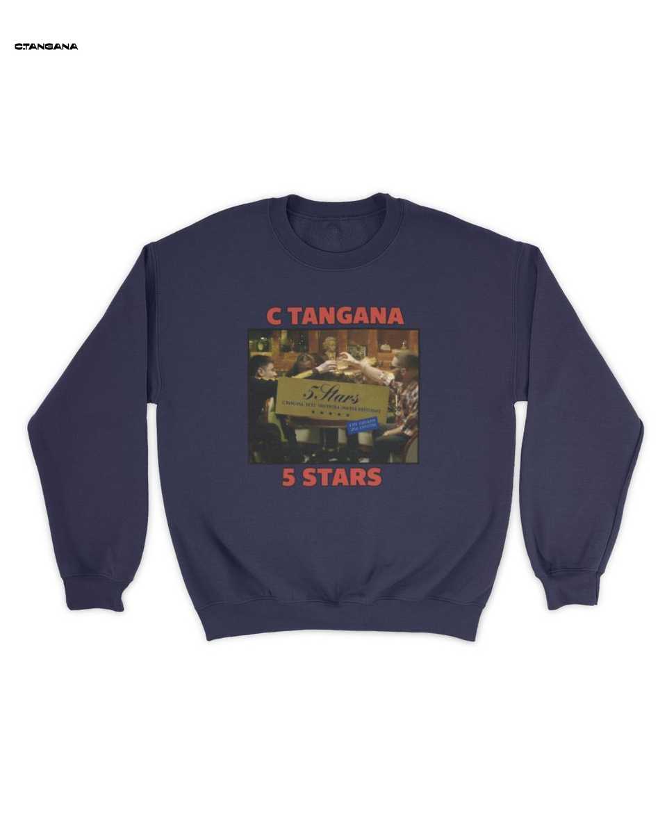 El diseño central evoca una vívida escena de celebración en estilo cómic, enmarcada por el nombre ‘C TANGANA’ y ‘5 STARS’ en rojo. Los tonos cálidos y detalles festivos lo convierten en una `camiseta temática celebración` que resuena con la energía y el `diseño gráfico música urbana` de Pucho.