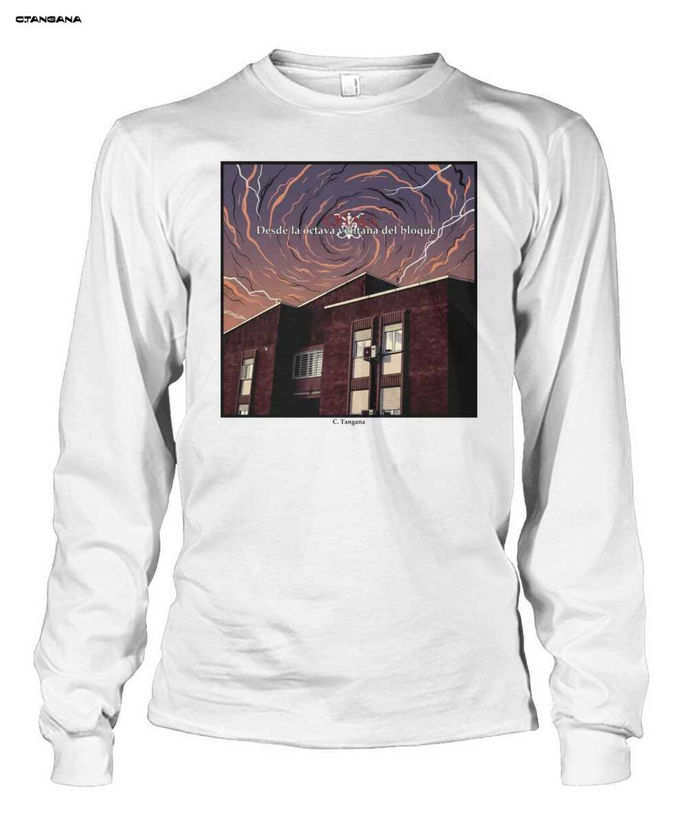 Esta no es una camiseta con un simple logo. Es una pieza de Ilustración artística que cuenta una historia. El diseño evoca la introspección y la visión del mundo desde una perspectiva única, un tema recurrente en la música de C. Tangana. El edificio de ladrillos, un símbolo del entorno urbano de Madrid, se erige como un testigo silencioso bajo un cielo tormentoso que arde en vibrantes tonos púrpuras y naranjas.